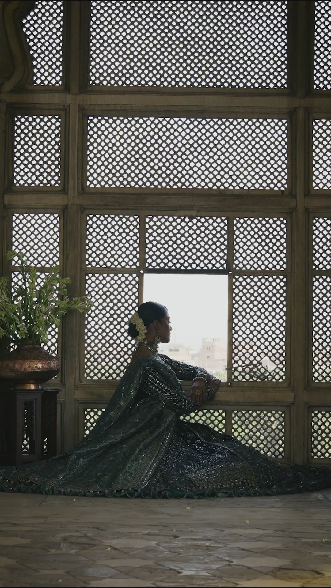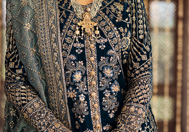 Look 05/10 Dastoor #AIKLuxuryVelvet ‘24 - A symphony of peacock hues, this design is anchored by a rich cobalt velvet base and enhanced by varying textures that create subtle tonal depth. The shirt features a delicate linear pattern, accentuated with soft, shimmering French-cut sequins, while the tulle skirt with intricate embroidery is layered over masoori silk for added dimension. The look is elevated by a dupatta adorned with the House’s signature jaal, embroidered on teal-dyed gold zari lame. Cobalt resham thread throughout the design amplifies the brilliance of the tilla and sequins, creating a luminous effect with every movement.