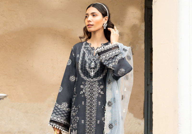 Summing up the collection with the final Look on satiny charcoal lawn. Decorated with artisanal flora and fauna embroideries interlaced in allover arrangements, inspired by the aari technique; and a powder blue tulle dupatta with a booti chatta of the kashi kari flower motif.