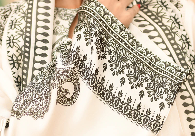 A finely detailed thin-lined pattern on this House signature black-on-white ensemble is contrasted by bold, structured motifs running across the hems and the airy silk dupatta. The loose-fit, short-length kameez and the flowing palazzo pants offer a modern, relaxed silhouette.