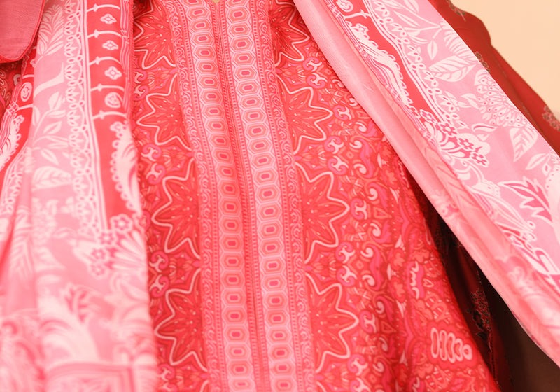 A vibrant fuchsia kameez in a long, oversized silhouette. The eye-catching kaleidoscopic pattern flows from the collar to the hem with subtle hints of green submerged into the print that provide a refreshing contrast to the vivid fuchsia backdrop.
